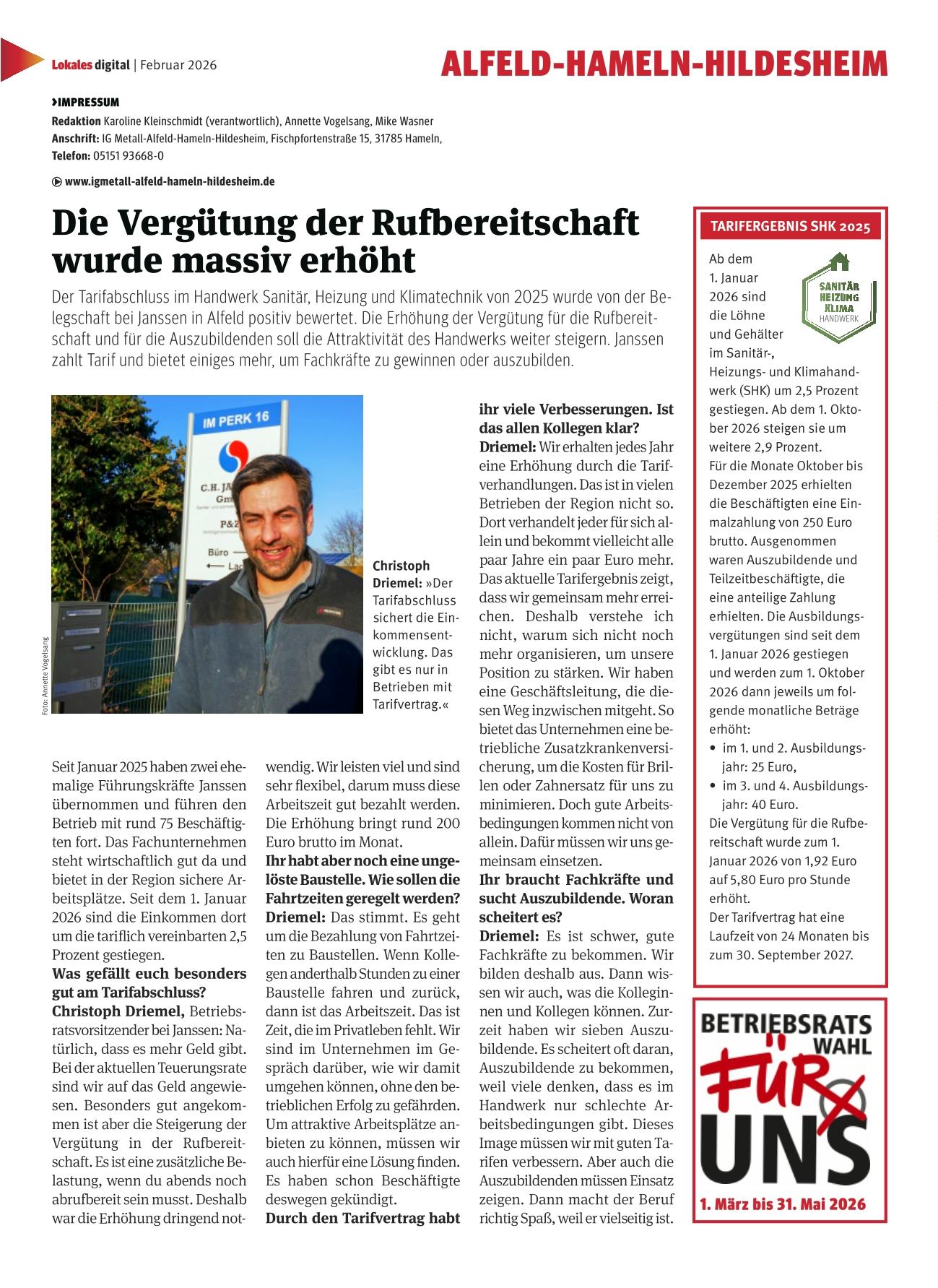 Seit Januar 2025 haben zwei ehemalige Führungskräfte Janssen übernommen und führen den Betrieb mit rund 75 Beschäftigten fort. Das Fachunternehmen steht wirtschaftlich gut da und bietet in der Region sichere Arbeitsplätze. Seit dem 1. Januar 2026 sind die Einkommen dort um die tariflich vereinbarten 2,5 Prozent gestiegen.