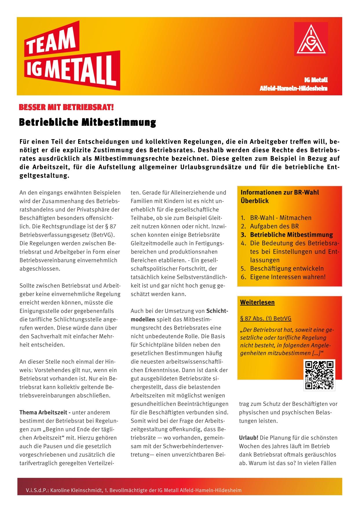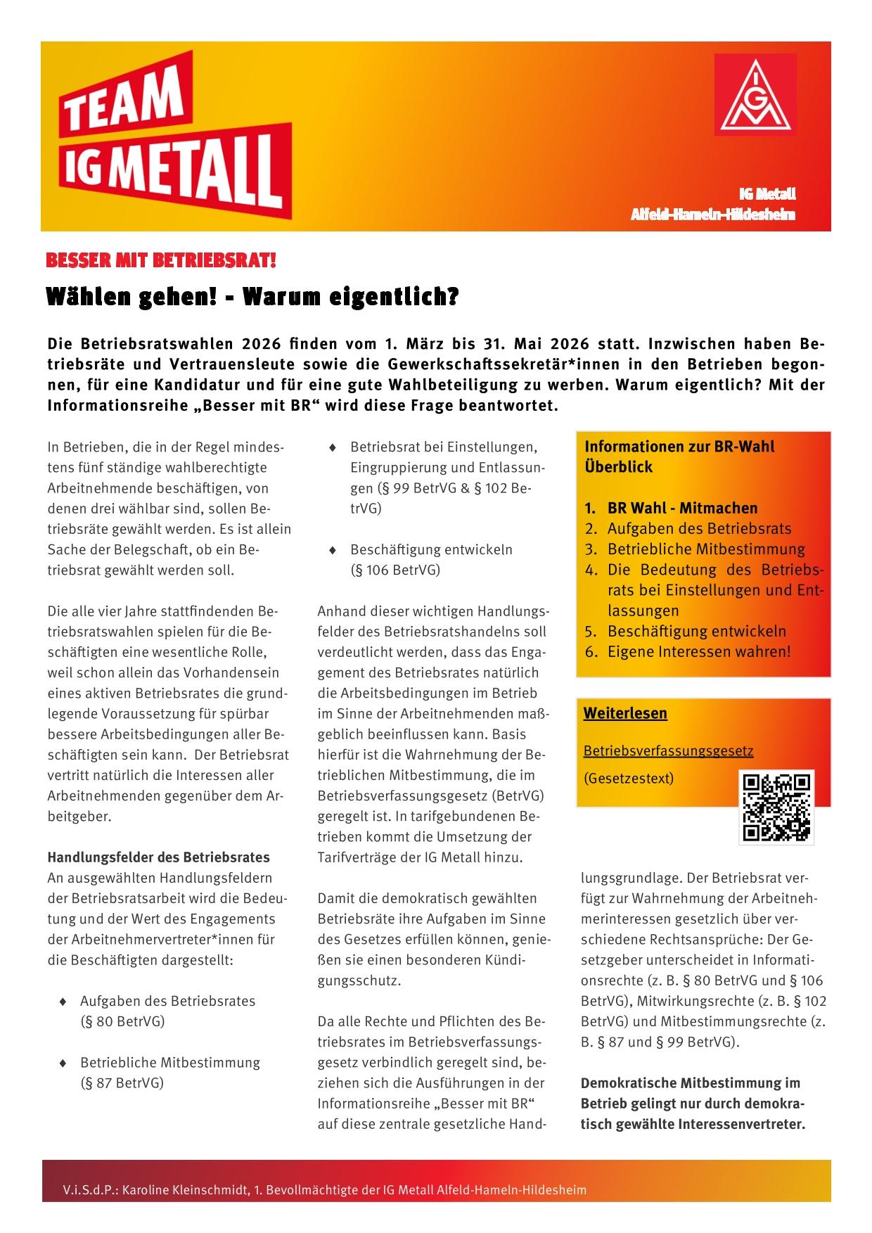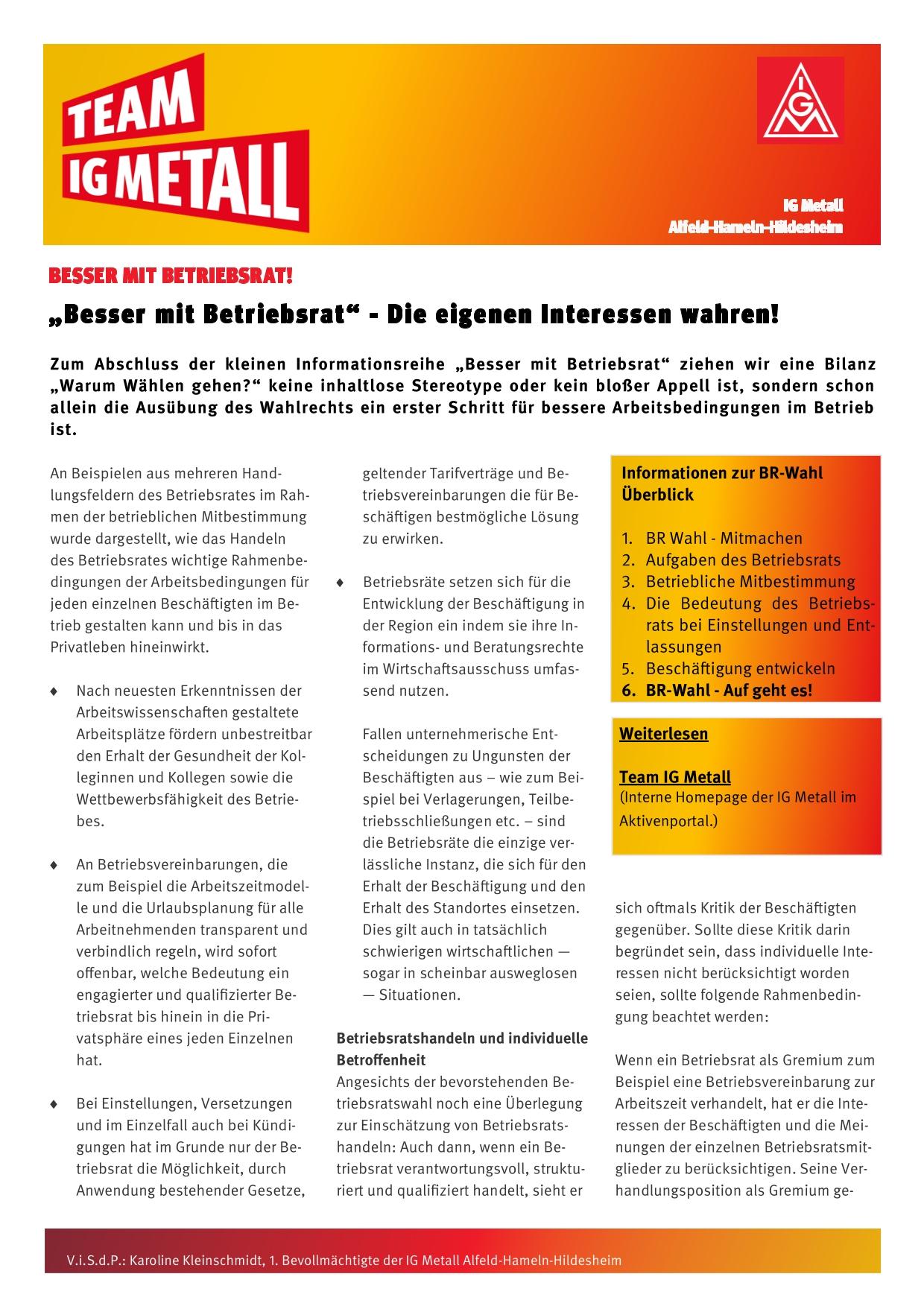Die Thesen werden an Themenfeldern der Betriebsratsarbeit im Rahmen einer sechsteiligen Informationsreihe „Besser mit Betriebsrat“ erläutert. Letztendlich sollte nach der Lektüre der Flugblattserie "Besser mit Betriebsrat" die Frage „Gehe ich wählen?“ beantwortet sein und sich im Grunde nicht mehr stellen - der Gang an die Urne für alle Arbeitnehmenden eine Selbstverständlichkeit sein.