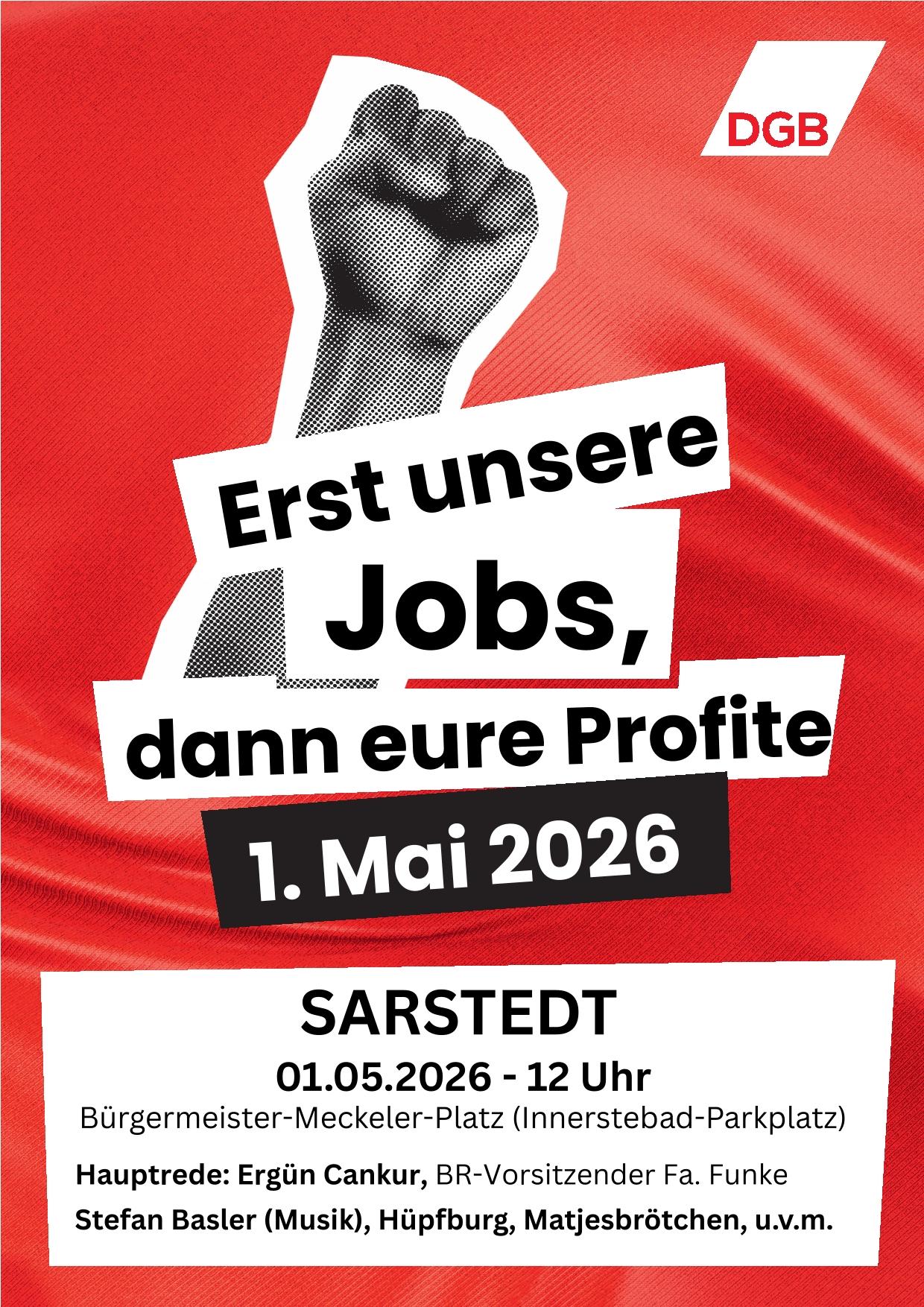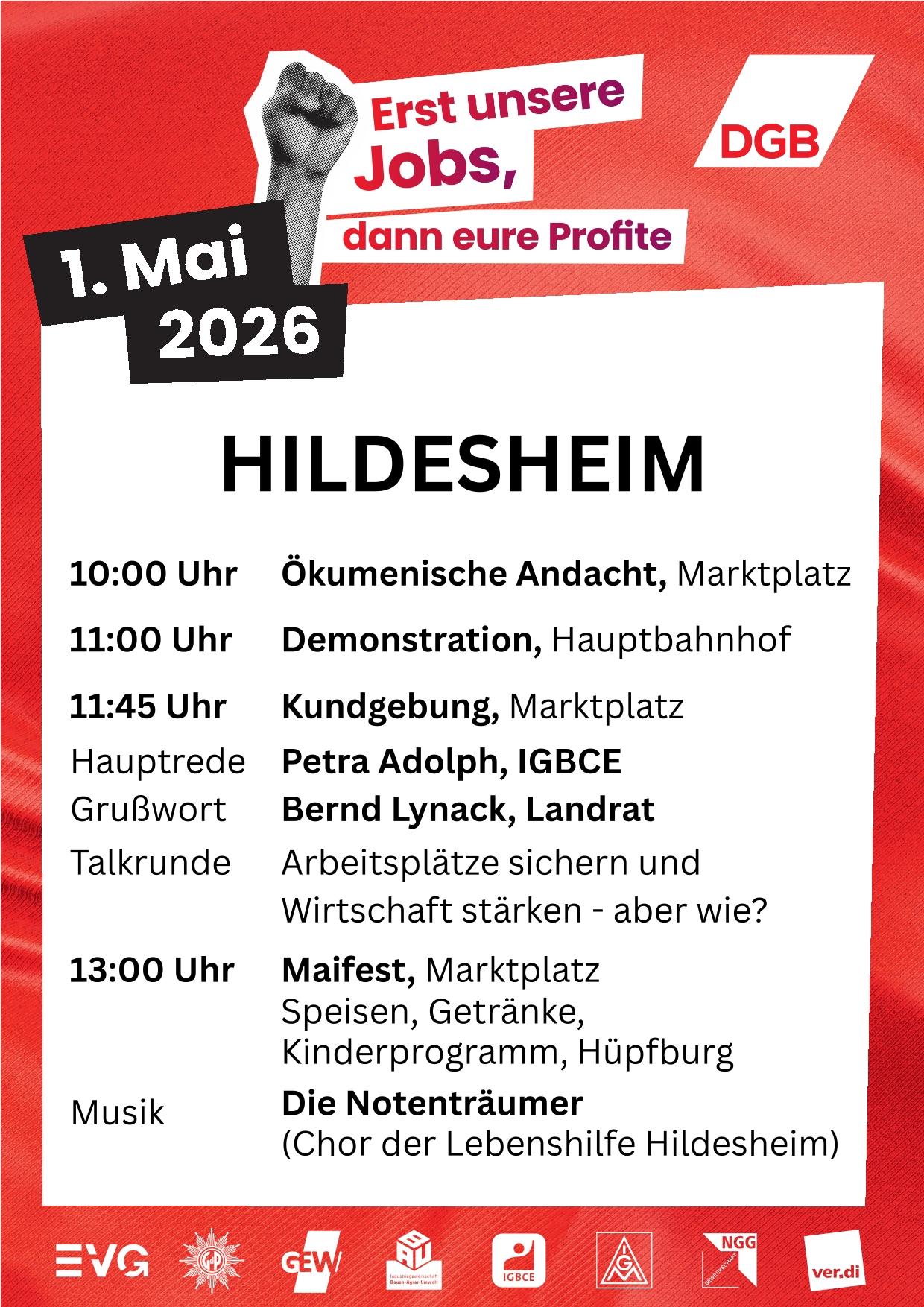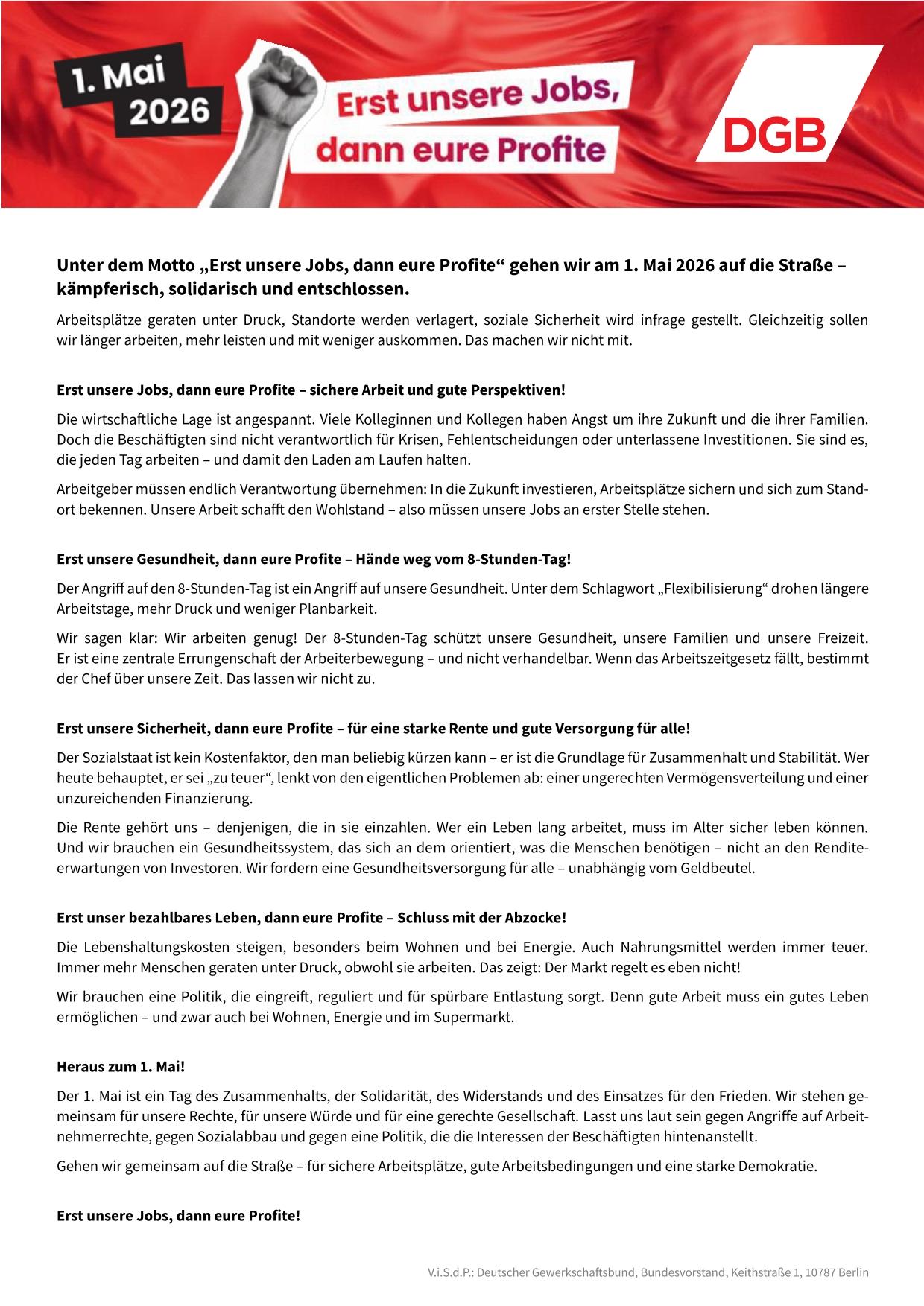 Der 1. Mai ist ein Tag des Zusammenhalts, der Solidarität, des Widerstands und des Einsatzes für den Frieden. Die Maifeier ist der ideale Ort, um gemeinsam für unsere Rechte, für unsere Würde und für eine gerechte Gesellschaft einzustehen. Lasst uns laut sein gegen Angriffe auf Arbeitnehmerrechte, gegen Sozialabbau und gegen eine Politik, die die Interessen der Beschäftigten und ihrer Familien hintenanstellt.