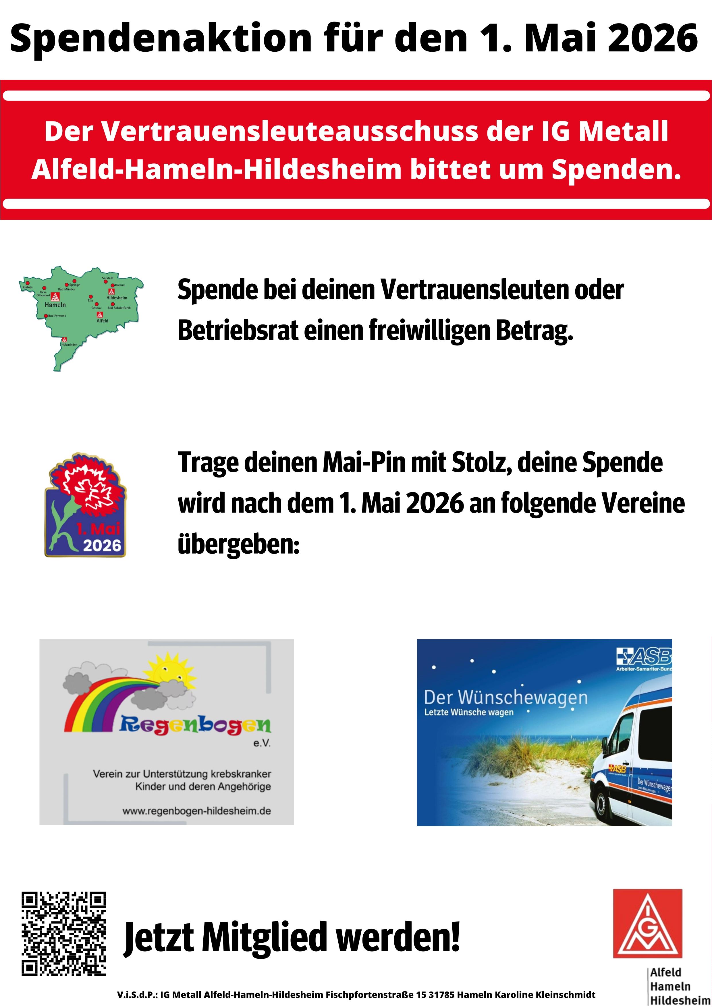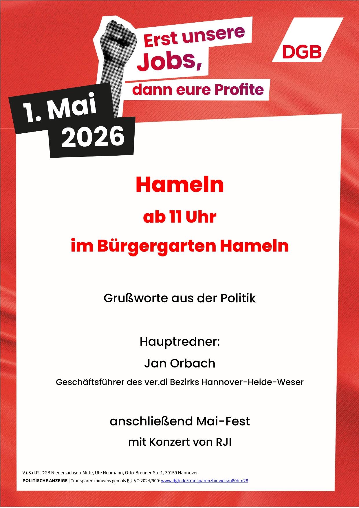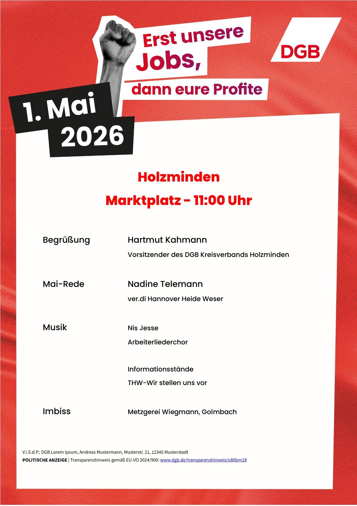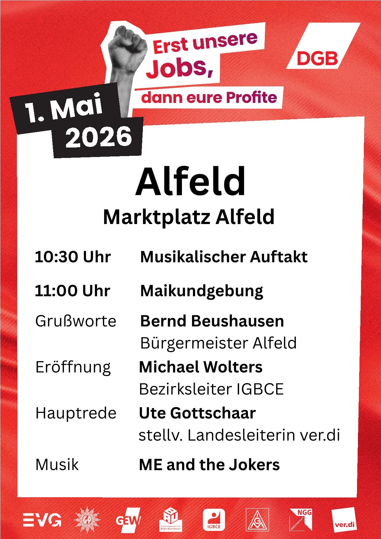 Der 1. Mai ist ein Tag des Zusammenhalts, der Solidarität, des Widerstands und des Einsatzes für den Frieden. Die Maifeier ist der ideale Ort, um gemeinsam für unsere Rechte, für unsere Würde und für eine gerechte Gesellschaft einzustehen. Lasst uns laut sein gegen Angriffe auf Arbeitnehmerrechte, gegen Sozialabbau und gegen eine Politik, die die Interessen der Beschäftigten und ihrer Familien hintenanstellt.